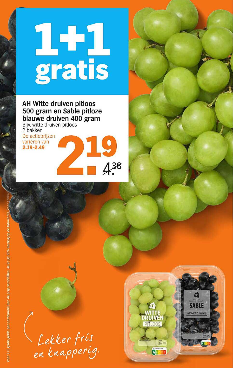 Bekijk de Ah Witte Druiven Pitloos En Sable Pitloze Blauwe Druiven aanbieding bij Albert Heijn! Deze fantastische aanbieding is nu beschikbaar in de nieuwste Albert Heijn folder. Profiteer van deze kans en bespaar flink op je aankoop.