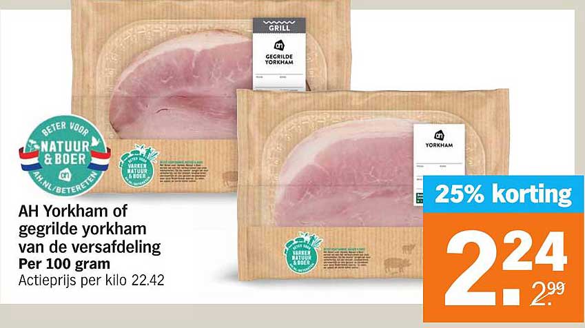 Bekijk nu de AH Yorkham of gegrilde yorkham van de versafdeling aanbieding in de Albert Heijn folder. Deze aanbieding is geldig van 28-10-2024 tot en met 03-11-2024.