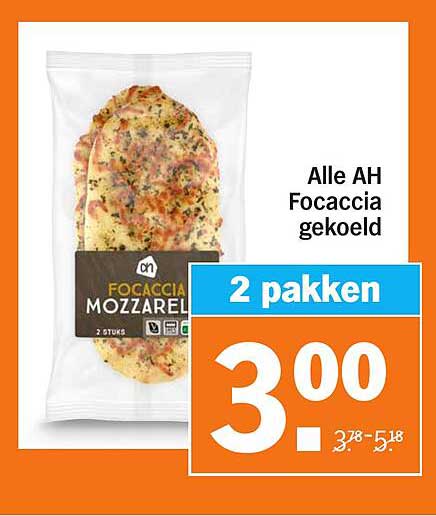 Bekijk de Alle Ah Focaccia Gekoeld aanbieding bij Albert Heijn! Deze fantastische aanbieding is nu beschikbaar in de nieuwste Albert Heijn folder. Profiteer van deze kans en bespaar flink op je aankoop.