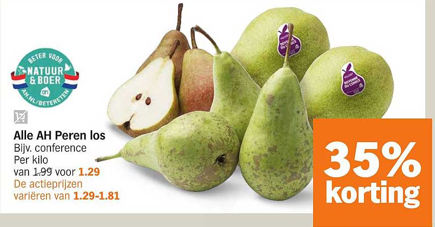 Bekijk de Alle Ah Peren Los aanbieding bij Albert Heijn! Deze fantastische aanbieding is nu beschikbaar in de nieuwste Albert Heijn folder. Profiteer van deze kans en bespaar flink op je aankoop.