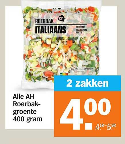 Bekijk de Alle Ah Roerbak-Groente aanbieding bij Albert Heijn! Deze fantastische aanbieding is nu beschikbaar in de nieuwste Albert Heijn folder. Profiteer van deze kans en bespaar flink op je aankoop.
