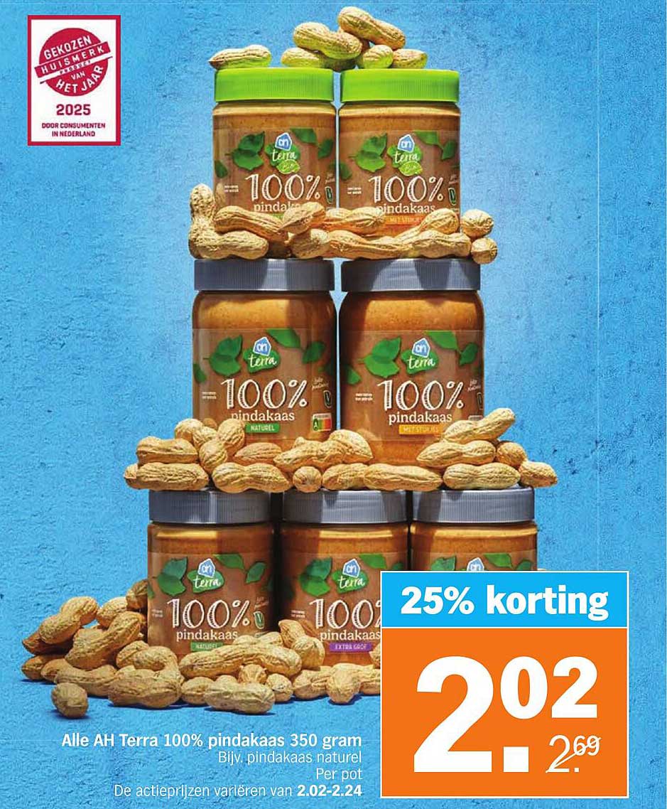 Bekijk nu de Alle AH Terra 100% pindakaas 350 gram aanbieding in de Albert Heijn folder. Deze aanbieding is geldig van 10-02-2025 tot en met 16-02-2025.