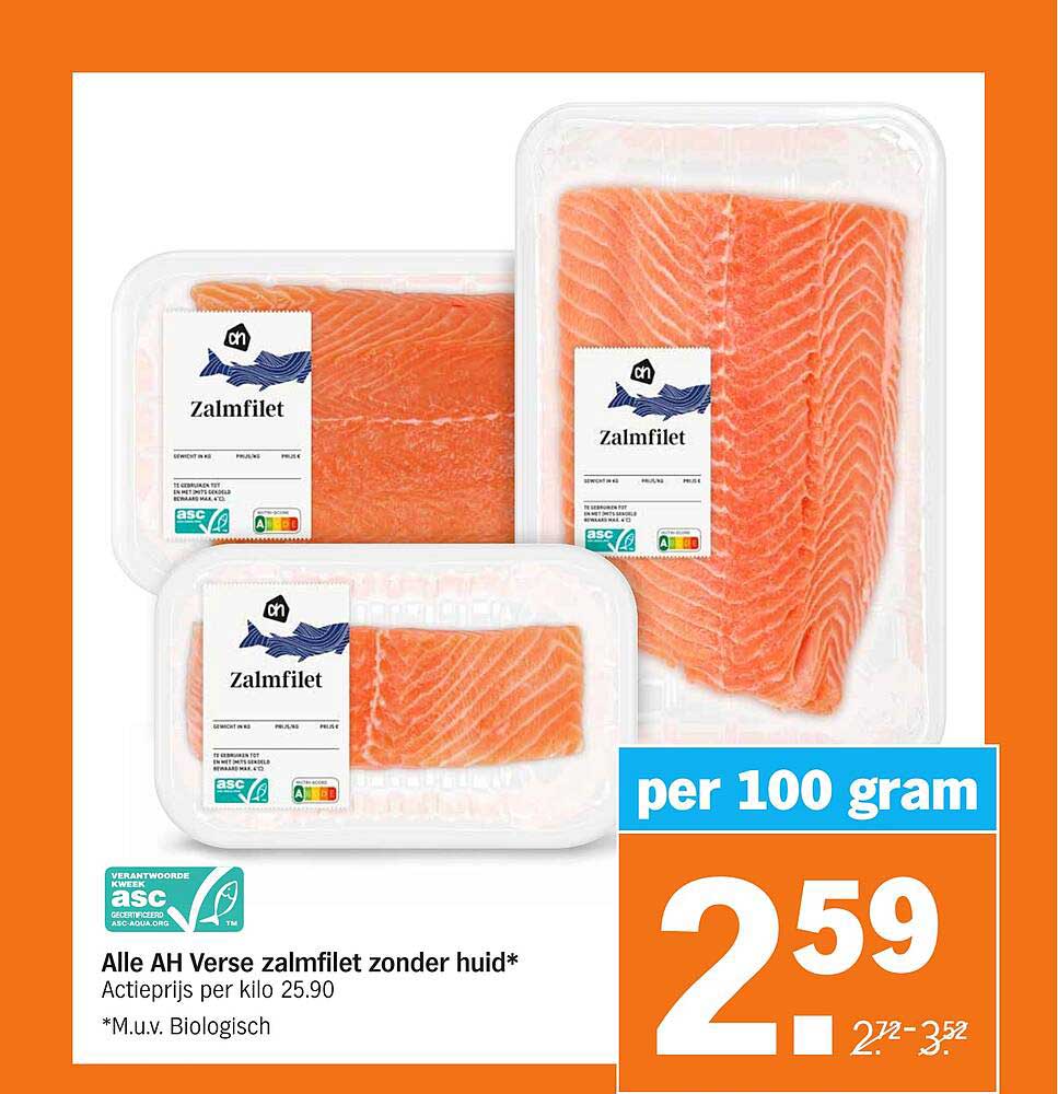 Bekijk nu de Alle AH Verse zalmfilet zonder huid* aanbieding in de Albert Heijn folder. Deze aanbieding is geldig van 31-03-2025 tot en met 06-04-2025.