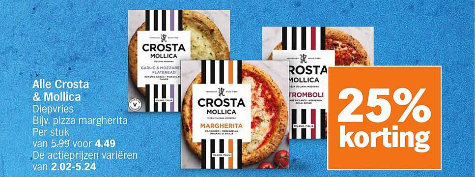 Deze aanbieding is echt een kans om te besparen! De normale prijs van de Crosta & Mollica producten bedraagt €5,99 per stuk, maar met de huidige korting koop je ze voor slechts €4,49. Dat is een korting van 25%! De actieprijzen variëren bovendien tussen de €2,02 en €5,24, wat dit aanbod extra aantrekkelijk maakt.