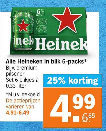Bekijk nu de Alle Heineken in blik 6-packs aanbieding in de Albert Heijn folder. Deze aanbieding is geldig van 21-04-2025 tot en met 27-04-2025.