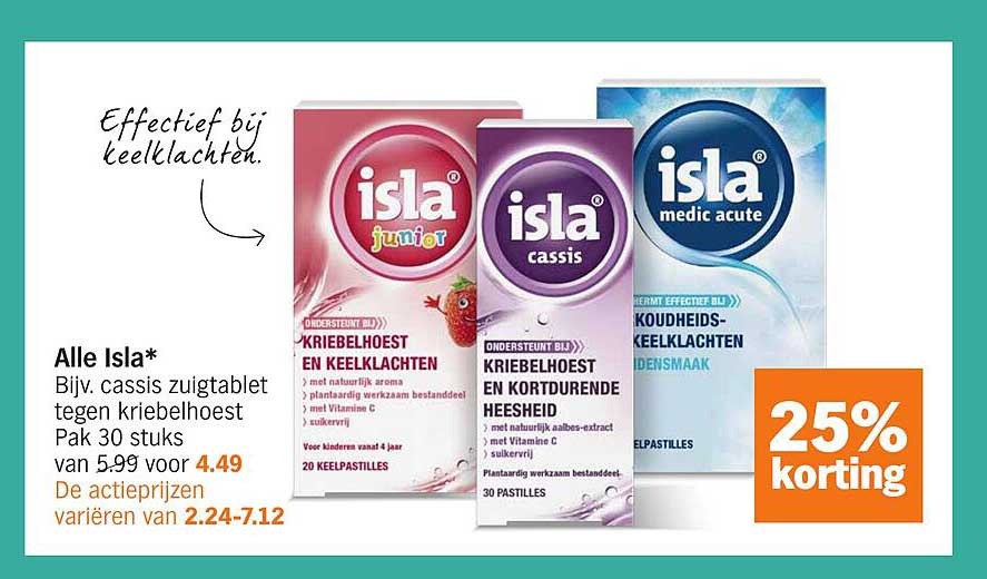 Heb je last van keelpijn of kriebelhoest? Dan is deze aanbieding van Isla precies wat je nodig hebt! Gedurende de actieperiode van 3 tot en met 8 november 2025 profiteer je van 25% korting op diverse Isla-producten. Isla biedt een assortiment zuigtabletten die effectief helpen bij keelschachten en hoestklachten. Deze aanbieding is een geweldige kans om je voorraad aan te vullen en tegelijk je gezondheid te ondersteunen.