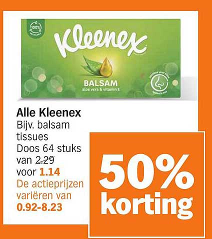 Bekijk de Alle Kleenex aanbieding bij Albert Heijn! Deze fantastische aanbieding is nu beschikbaar in de nieuwste Albert Heijn folder. Profiteer van deze kans en bespaar flink op je aankoop.