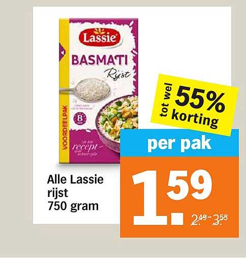 Bekijk de Alle Lassie Rijst aanbieding bij Albert Heijn! Deze fantastische aanbieding is nu beschikbaar in de nieuwste Albert Heijn folder. Profiteer van deze kans en bespaar flink op je aankoop.