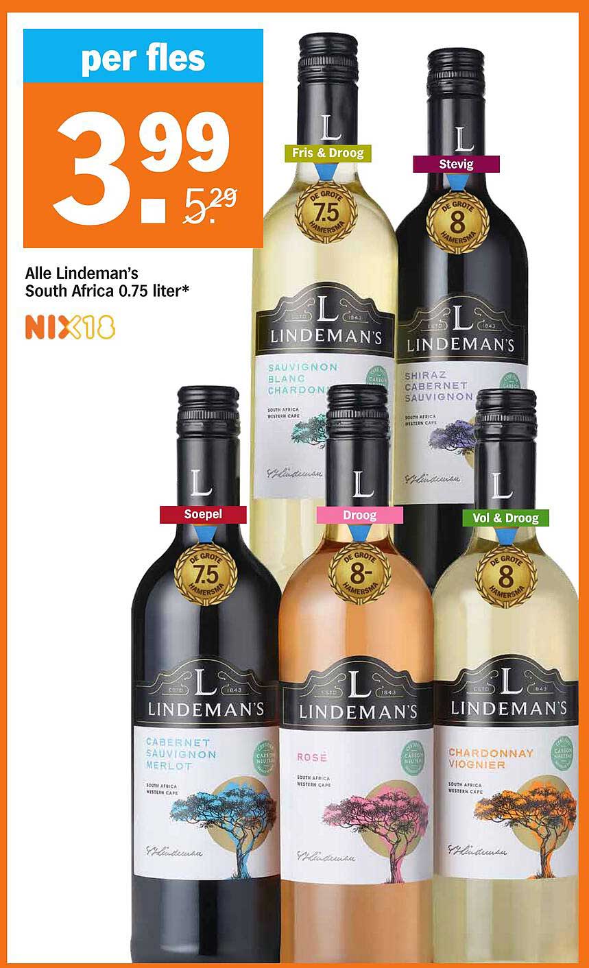 Bekijk de Alle Lindeman’s South Africa 0.75 Liter* aanbieding bij Albert Heijn! Deze fantastische aanbieding is nu beschikbaar in de nieuwste Albert Heijn folder. Profiteer van deze kans en bespaar flink op je aankoop.