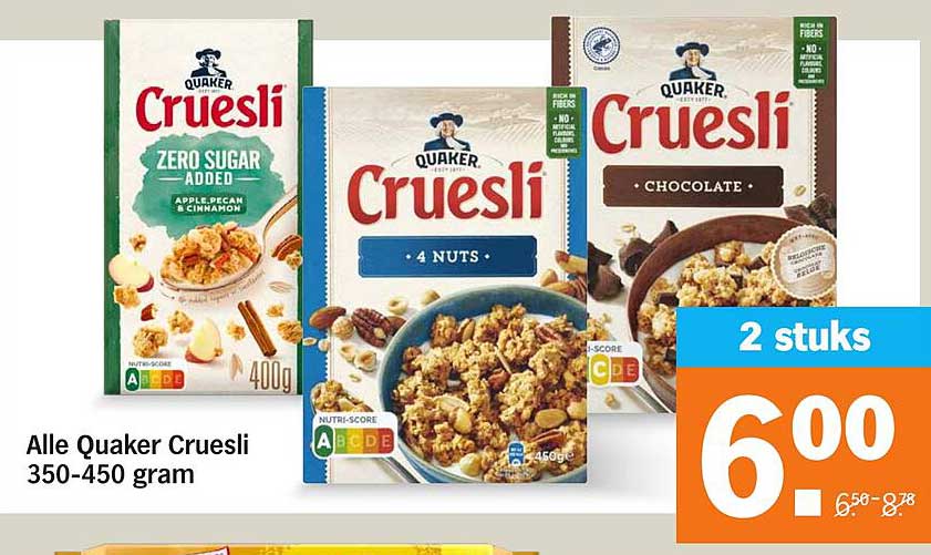 Bekijk de Alle Quaker Cruesli 350-450 Gram aanbieding bij Albert Heijn! Deze fantastische aanbieding is nu beschikbaar in de nieuwste Albert Heijn folder. Profiteer van deze kans en bespaar flink op je aankoop.