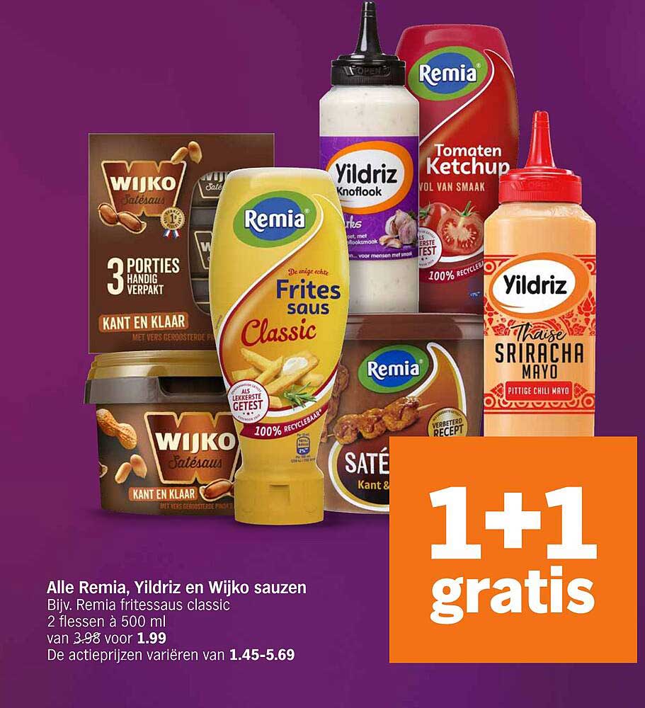 Bekijk de Alle Remia, Yildriz En Wijko Sauzen aanbieding bij Albert Heijn! Deze fantastische aanbieding is nu beschikbaar in de nieuwste Albert Heijn folder. Profiteer van deze kans en bespaar flink op je aankoop.
