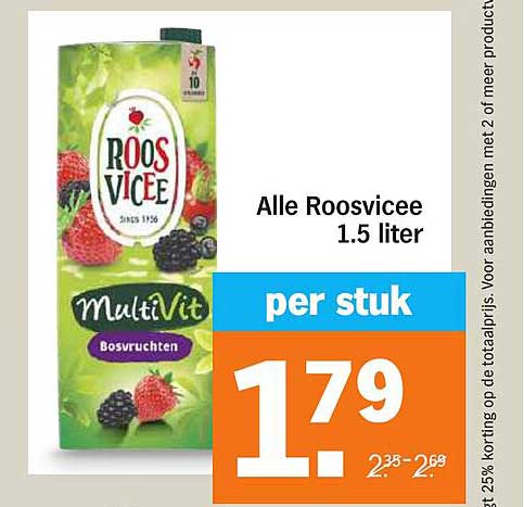 Bekijk de Alle Roosvicee 1.5 Liter aanbieding bij Albert Heijn! Deze fantastische aanbieding is nu beschikbaar in de nieuwste Albert Heijn folder. Profiteer van deze kans en bespaar flink op je aankoop.
