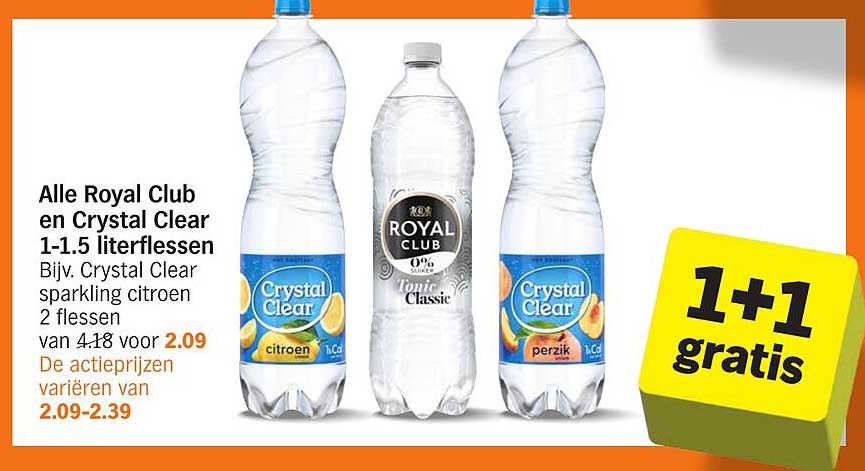 Bekijk de Alle Royal Club En Crystal Clear 1-1.5 Literflessen aanbieding bij Albert Heijn! Deze fantastische aanbieding is nu beschikbaar in de nieuwste Albert Heijn folder. Profiteer van deze kans en bespaar flink op je aankoop.