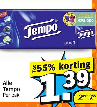 Bekijk de Alle Tempo aanbieding bij Albert Heijn! Deze fantastische aanbieding is nu beschikbaar in de nieuwste Albert Heijn folder. Profiteer van deze kans en bespaar flink op je aankoop.