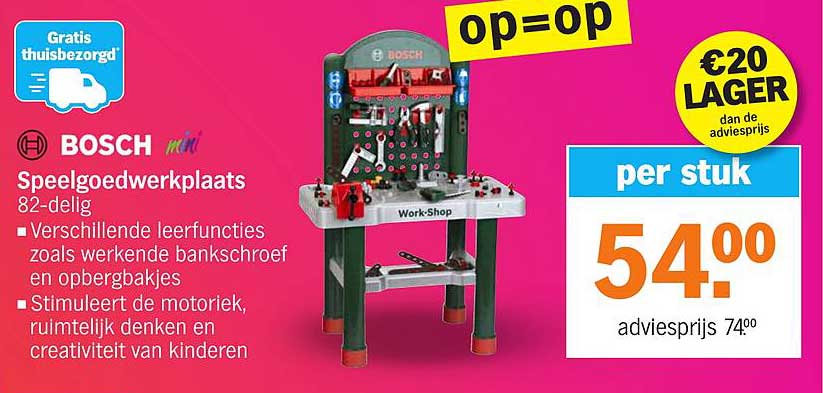 Ontdek de geweldige Bosch Mini Speelgoedwerkplaats aanbieding in de nieuwste Albert Heijn folder. Naast deze aanbieding vind je nog veel meer aantrekkelijke kortingen. Je kunt de Bosch Mini Speelgoedwerkplaats eenvoudig online bestellen via de Albert Heijn website of kopen in een winkel bij jou in de buurt.