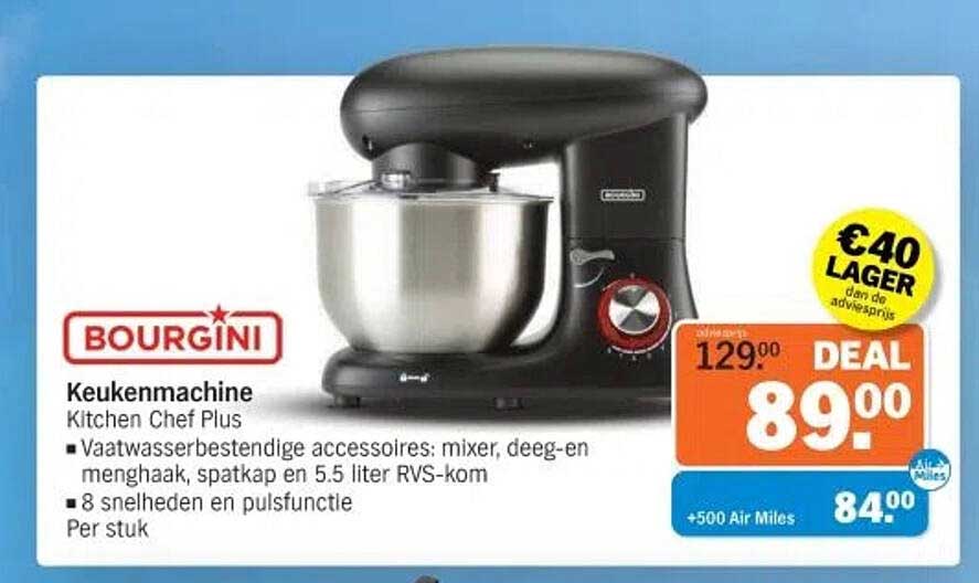 Bekijk de Bourgini Keukenmachine aanbieding bij Albert Heijn! Deze fantastische aanbieding is nu beschikbaar in de nieuwste Albert Heijn folder. Profiteer van deze kans en bespaar flink op je aankoop.