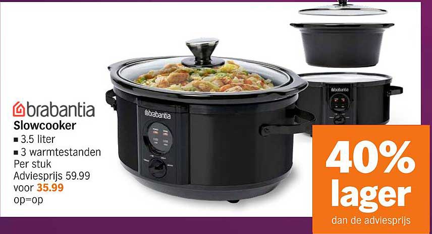 Ontdek de geweldige Brabantia Slowcooker aanbieding in de nieuwste Albert Heijn folder. Naast deze aanbieding vind je nog veel meer aantrekkelijke kortingen. Je kunt de Brabantia Slowcooker eenvoudig online bestellen via de Albert Heijn website of kopen in een winkel bij jou in de buurt.