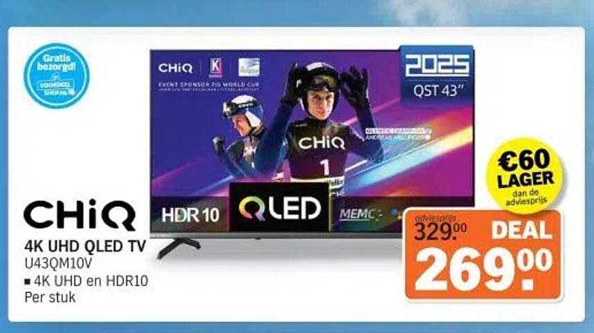 Ben jij klaar om je kijkervaring naar een hoger niveau te tillen? Deze week biedt Albert Heijn een geweldige kans om de CHiQ 4K UHD QLED TV U43QM10V te bemachtigen voor een ongeëvenaarde prijs. Met zijn adembenemende beeldkwaliteit en moderne technologieën is deze tv perfect voor het streamen van films, sportevenementen en jouw favoriete series.
