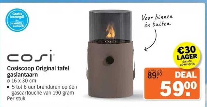 Bekijk nu de Cosi Original tafel gaslantaarn aanbieding in de Albert Heijn folder. Deze aanbieding is geldig van 19-10-2025 tot en met 25-10-2025.