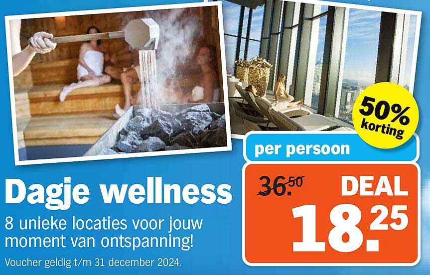 Bekijk de Dagje Wellness aanbieding bij Albert Heijn! Deze fantastische aanbieding is nu beschikbaar in de nieuwste Albert Heijn folder. Profiteer van deze kans en bespaar flink op je aankoop.