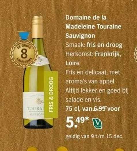 Bekijk de Domaine De La Madeleine Touraine Sauvignon aanbieding bij Albert Heijn! Deze fantastische aanbieding is nu beschikbaar in de nieuwste Albert Heijn folder. Profiteer van deze kans en bespaar flink op je aankoop.