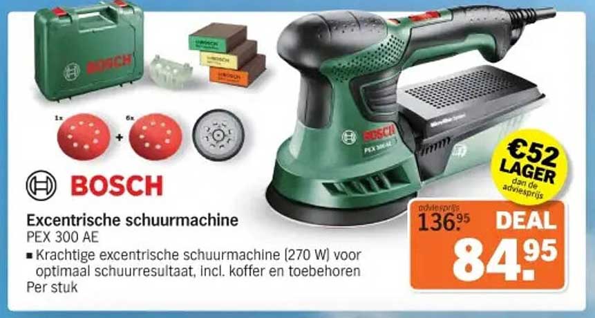 Normaal gesproken kost de Excentrische schuurmachine PEX 300 AE €136,95, maar dankzij deze aanbieding kun je hem nu voor slechts €84,95 aanschaffen! Dit betekent een korting van €52,-, wat het voor jou aantrekkelijker maakt om je klusproducten aan te schaffen. Deze geweldige deal is een kans die je niet wilt missen!