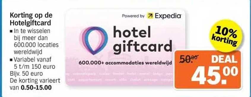 Heb je plannen om binnenkort op reis te gaan, maar wil je nu al slim besparen? De Hotelgiftcard aanbieding is precies wat je nodig hebt! Met het op maat gemaakte kortingspercentages biedt deze giftcard je de mogelijkheid om te genieten van 600.000+ accommodaties wereldwijd. Van luxe hotels tot gezellige bed and breakfasts, met de Hotelgiftcard heb je de wereld aan je voeten.