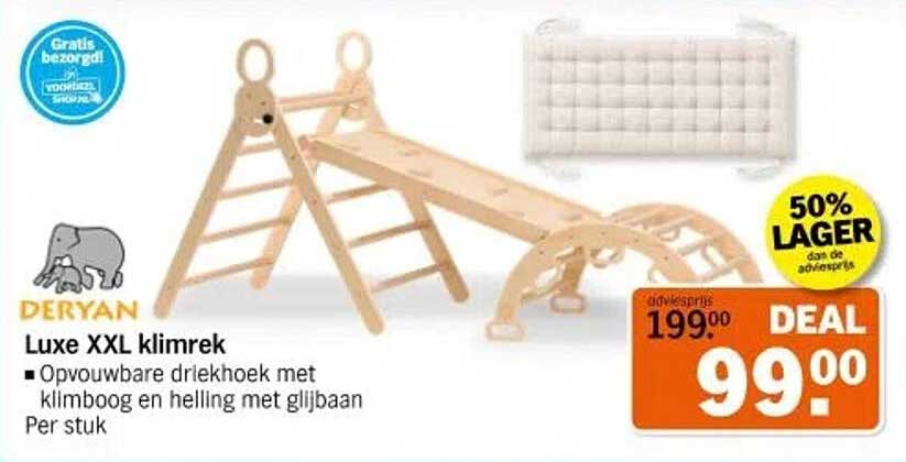 Ben je op zoek naar een fantastische manier om jouw kinderen te laten spelen, bewegen en hun motorische vaardigheden te ontwikkelen? Zoek niet verder! Op deze pagina vind je het Luxe XXL klimrek van Deryan, nu met een waanzinnige korting. Dit klimrek is perfect voor kinderen die graag klauteren en spelen, en het is ontworpen om aan al hun speelse verlangens te voldoen. Met een opvouwbare driekhoek-constructie kunnen kinderen veilig klimmen en spelen, terwijl ouders zich geen zorgen hoeven te maken.