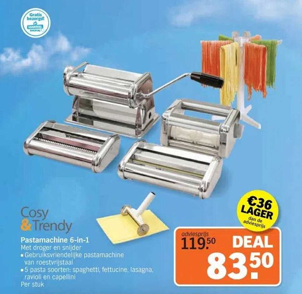 Ben je een liefhebber van versgemaakte pasta? Dan is deze aanbieding iets voor jou! De Cosy & Trendy Pastamachine 6-in-1, met zowel een droger als snijder, maakt het mogelijk om in een handomdraai verschillende soorten pasta te bereiden. Van spaghetti tot lasagna, met deze gebruiksvriendelijke pastamachine kun je je eigen creaties maken en genieten van de authentieke smaak van zelfgemaakt pasta. Deze aanbieding is geldig van 4 tot en met 10 augustus 2025, dus zorg dat je het niet mist!