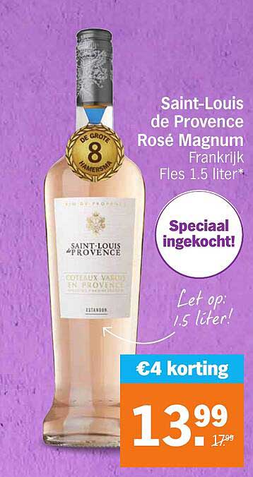 Bekijk nu de Saint-Louis de Provence Rosé Magnum 1.5 liter aanbieding in de Albert Heijn folder. Deze aanbieding is geldig van 14-04-2025 tot en met 20-04-2025.