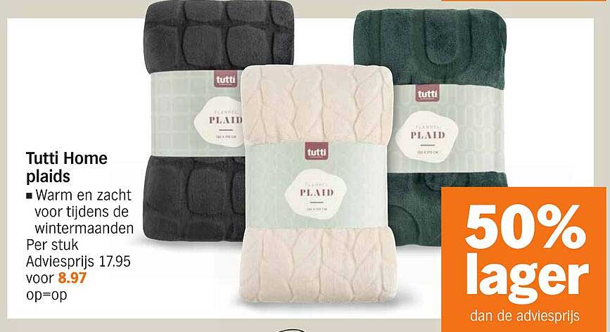 Bekijk de Tutti Home Plaids aanbieding bij Albert Heijn! Deze fantastische aanbieding is nu beschikbaar in de nieuwste Albert Heijn folder. Profiteer van deze kans en bespaar flink op je aankoop.