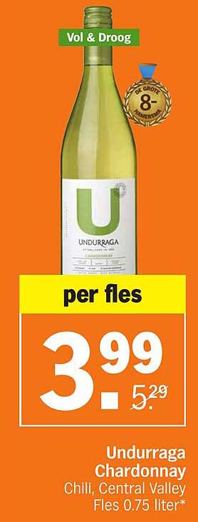 Bekijk de Undurraga Chardonnay aanbieding bij Albert Heijn! Deze fantastische aanbieding is nu beschikbaar in de nieuwste Albert Heijn folder. Profiteer van deze kans en bespaar flink op je aankoop.