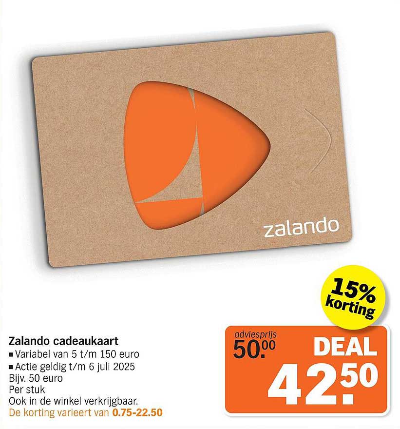 Bekijk nu de Zalando cadeaukaart aanbieding in de Albert Heijn folder. Deze aanbieding is geldig van 16-06-2025 tot en met 22-06-2025.