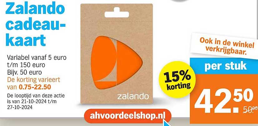 Bekijk nu de Zalando cadeaukaart aanbieding in de Albert Heijn folder. Deze aanbieding is geldig van 21-10-2024 tot en met 27-10-2024.