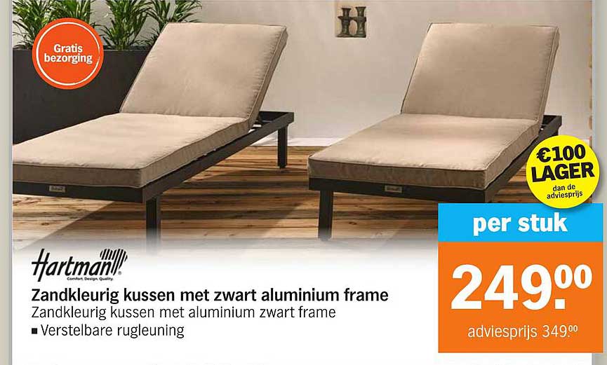 Wie houdt nu niet van ontspannen in de zon? Met het zandkleurige kussen met zwart aluminium frame van Hartman kun je optimaal genieten van je tuin of terras. Deze aanbieding maakt het voor jou mogelijk om luxe en comfort aan je buitenruimte toe te voegen, zonder je budget te overschrijden.
