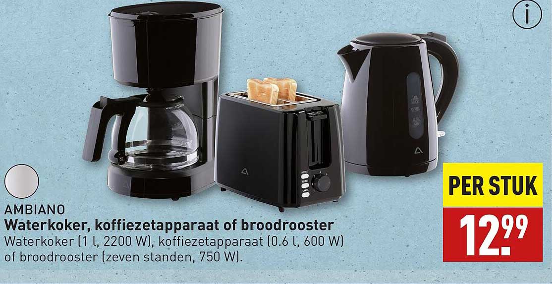 Bekijk de Ambiano Waterkoker, Koffiezetapparaat Of Broodrooster aanbieding bij ALDI! Deze fantastische aanbieding is nu beschikbaar in de nieuwste ALDI folder. Profiteer van deze kans en bespaar flink op je aankoop.
