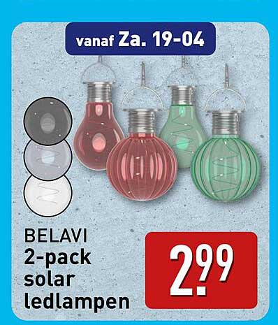 Bekijk nu de BELAVI 2-pack solar ledlampen aanbieding in de ALDI folder. Deze aanbieding is geldig van 14-04-2025 tot en met 20-04-2025.