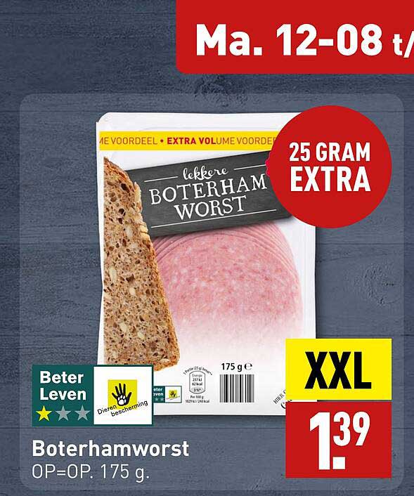 Bekijk nu de Boterhamworst aanbieding in de ALDI folder. Deze aanbieding is geldig van 12-08-2024 tot en met 18-08-2024.