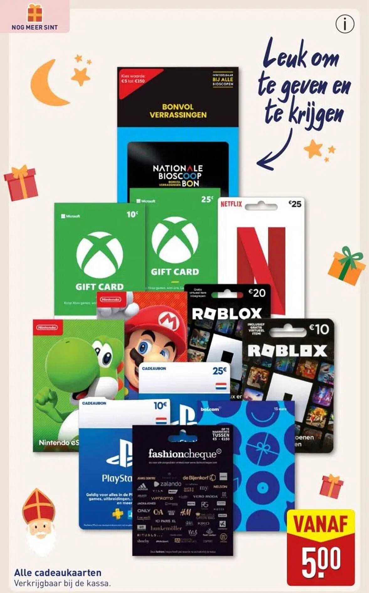 Bekijk nu de Cadeaukaarten vanaf €5,00 aanbieding in de ALDI folder. Deze aanbieding is geldig van 12-10-2025 tot en met 05-12-2025.