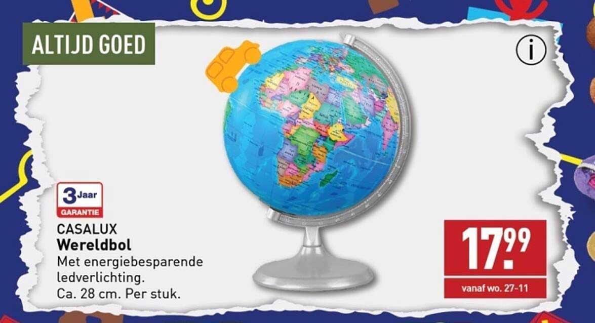 Bekijk nu de CASALUX Wereldbol aanbieding in de ALDI folder. Deze aanbieding is geldig van 11-11-2024 tot en met 17-11-2024.