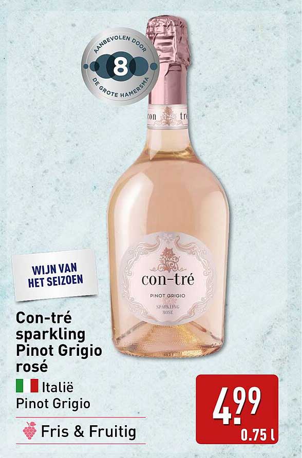 Ontdek de geweldige Con-Tré Sparkling Pinot Grigio Rosé aanbieding in de nieuwste ALDI folder. Naast deze aanbieding vind je nog veel meer aantrekkelijke kortingen. Je kunt de Con-Tré Sparkling Pinot Grigio Rosé eenvoudig online bestellen via de ALDI website of kopen in een winkel bij jou in de buurt.