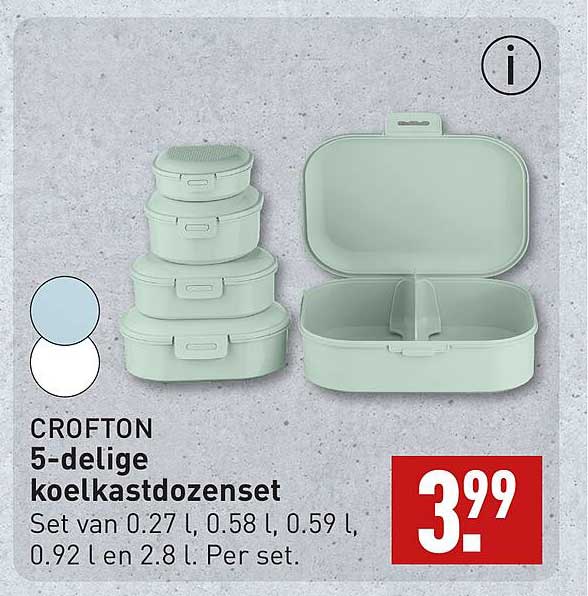 Bekijk de Crofton 5-Delige Koelkastdozenset aanbieding bij ALDI! Deze fantastische aanbieding is nu beschikbaar in de nieuwste ALDI folder. Profiteer van deze kans en bespaar flink op je aankoop.