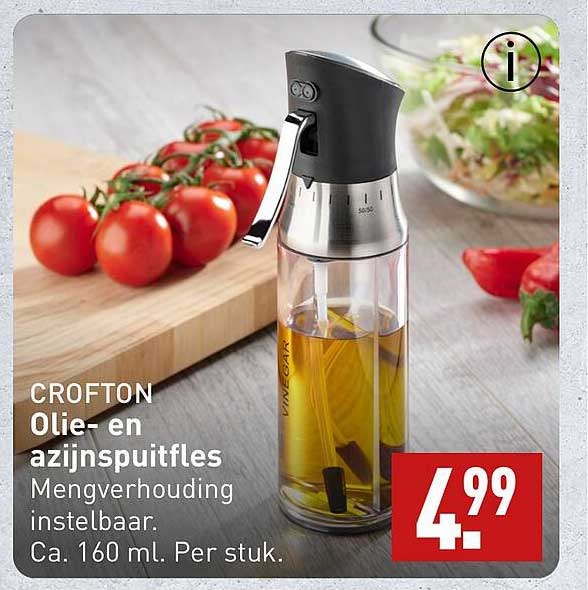 Bekijk de Crofton Olie- En Azijnspuitfles aanbieding bij ALDI! Deze fantastische aanbieding is nu beschikbaar in de nieuwste ALDI folder. Profiteer van deze kans en bespaar flink op je aankoop.