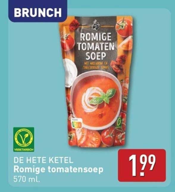 Bekijk nu de DE HETE KETEL Romige tomatensoep 570 ml. aanbieding in de ALDI folder. Deze aanbieding is geldig van 06-04-2025 tot en met 21-04-2025.