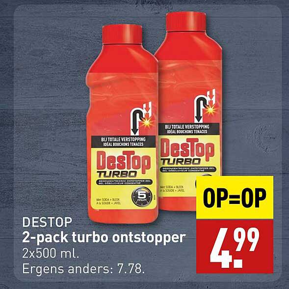 Ontdek de geweldige Destop 2-Pack Turbo Ontstopper aanbieding in de nieuwste ALDI folder. Naast deze aanbieding vind je nog veel meer aantrekkelijke kortingen. Je kunt de Destop 2-Pack Turbo Ontstopper eenvoudig online bestellen via de ALDI website of kopen in een winkel bij jou in de buurt.