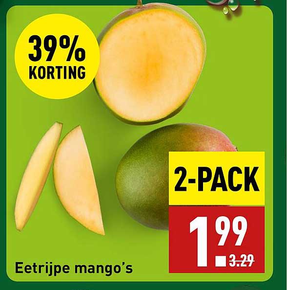 Bekijk de Eetrijpe Mango’s aanbieding bij ALDI! Deze fantastische aanbieding is nu beschikbaar in de nieuwste ALDI folder. Profiteer van deze kans en bespaar flink op je aankoop.