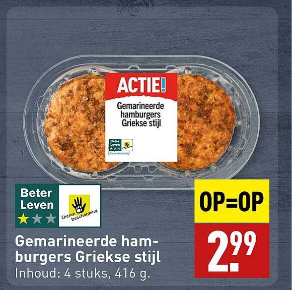 Bekijk de Gemarineerde Hamburgers Griekse Stijl aanbieding bij ALDI! Deze fantastische aanbieding is nu beschikbaar in de nieuwste ALDI folder. Profiteer van deze kans en bespaar flink op je aankoop.
