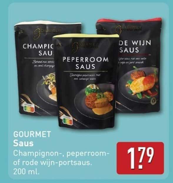 Bekijk nu de GOURMET Saus Champignon-, pepperroom- of rode wijn-portsaus. 200 ml. aanbieding in de ALDI folder. Deze aanbieding is geldig van 06-04-2025 tot en met 21-04-2025.