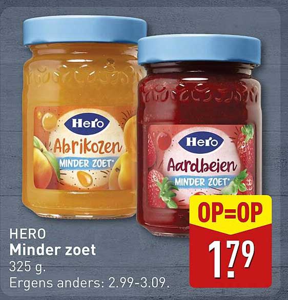 Ontdek de geweldige Hero Minder Zoet aanbieding in de nieuwste ALDI folder. Naast deze aanbieding vind je nog veel meer aantrekkelijke kortingen. Je kunt de Hero Minder Zoet eenvoudig online bestellen via de ALDI website of kopen in een winkel bij jou in de buurt.