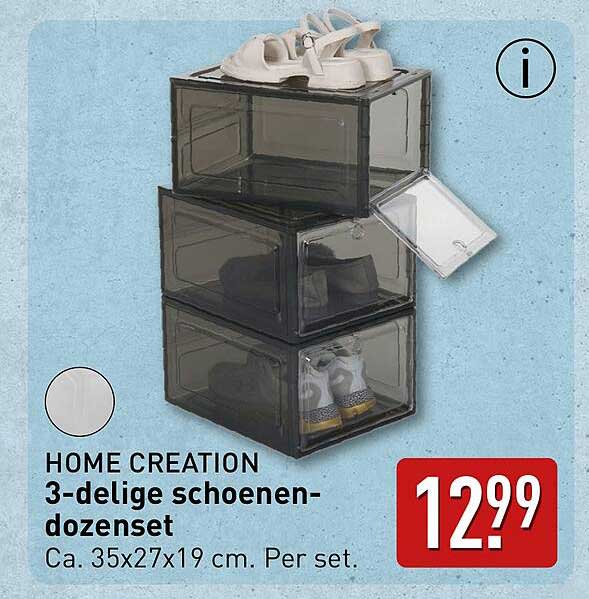 Bekijk de Home Creation 3-Delige Schoendozenet aanbieding bij ALDI! Deze fantastische aanbieding is nu beschikbaar in de nieuwste ALDI folder. Profiteer van deze kans en bespaar flink op je aankoop.